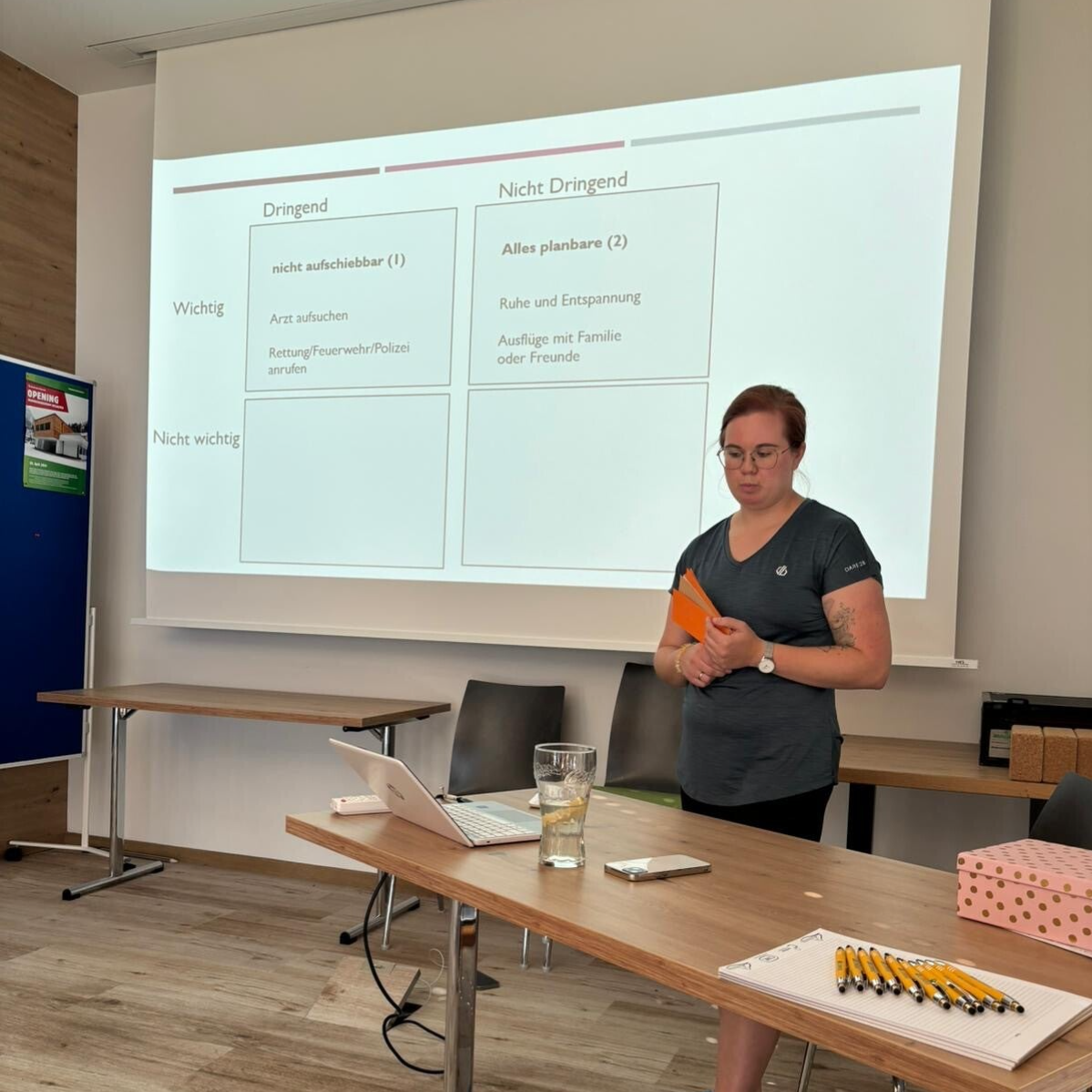 Gemeinsam mit der Firmenleitung haben wir uns im Vorfeld ein Konzept überlegt, wie sie die Aufgaben in der Firma noch besser bewältigen können. Das Konzept beruht auf dem Eisenhower- Prinzip. Dabei geht es um eine Prioritätssetzung von Aufgaben nach den Kriterien Dringlichkeit und Wichtigkeit. Ich lieferte die Theorie dazu und danach erklärten die Chefleute wie sie das ganze ab nun in der Firma umsetzen wollen. Dabei entstand ein tolles Gespräch und viele zusätzliche Ideen. Der zweite Teil war dem Thema Glück und Flow gewidmet, Im Mittelpunkt stand die Frage: "Wie schaffe ich es glücklich zu arbeiten?". Außerdem redeten wir über die 13 Wege zum allgemeinen Glück. Hierbei habe ich erste Tipps und Tricks gegeben, wie man es selbst schafft glücklicher zu sein. Den ursprünglich geplanten dritten Teil über das Thema Stress haben wir nun auf den Oktober verschoben. Worauf ich mich jetzt schon sehr freue, weil ich hier viele Techniken zur Selbsthilfe mit den Angestellten teilen werde.